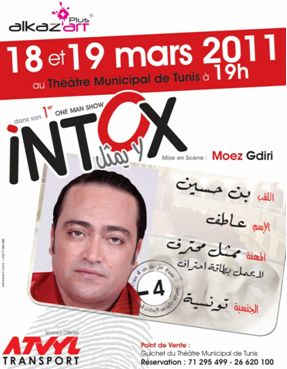 Avec un nouveau look en cheveux long, Atef ben Hassine alias Choco, s’est présenté au théâtre municipal le Vendredi 18 Mars 2011 avec son premier one man show, Intox. Cette pièce était longtemps attendue par les fans de théâtre car à la fin de l’année 2010, on voyait partout des affiches publicitaires de cette pièce sans voir la tête de l’acteur. Suite aux événements de la révolution, la tête d’affiche a été révélée et on s’est précipité pour acheter les billets.