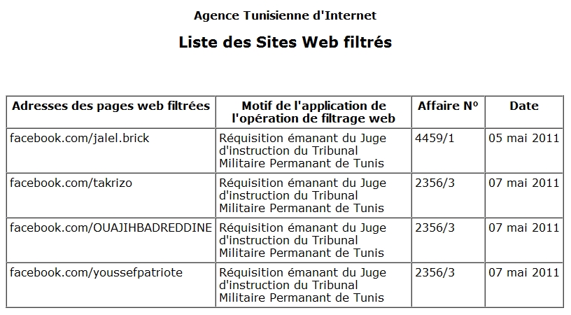 Notons que le terme utilisé pour décrire cette censure est « filtrer« , les messages qui figurent sur ces pages évoque que « Cette page web a été filtrée en application d’une réquisitionémanant du Juge d’instruction auprès du Tribunal Militaire Permanent de Tunis« , nous notons aussi le terme « filtrée« , cela exprime sans doute une volonté de cessation avec la censure de l’ancien régime et son employé connu sous le nom de Ammar 404.