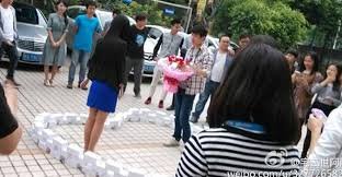 Une demande en mariage originale, nous venant tout droit de Chine, a affolé la toile hier et le fait toujours aujourd’hui. Un jeune Chinois a pris son courage à deux mains et s’est lancé pour demander sa belle en mariage mais malgré le moyen utilisé, elle a dit non!